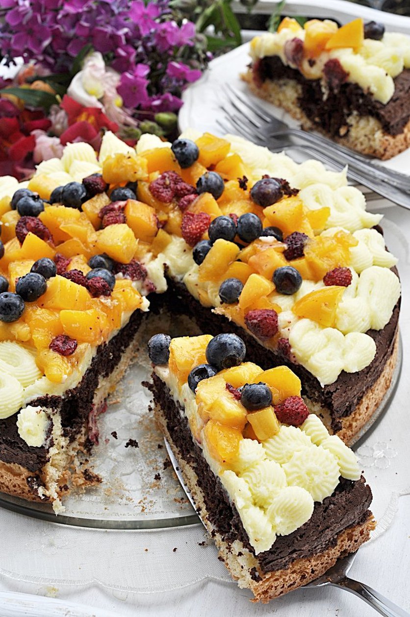 dwukolorowe ciasto z kremem i owocami