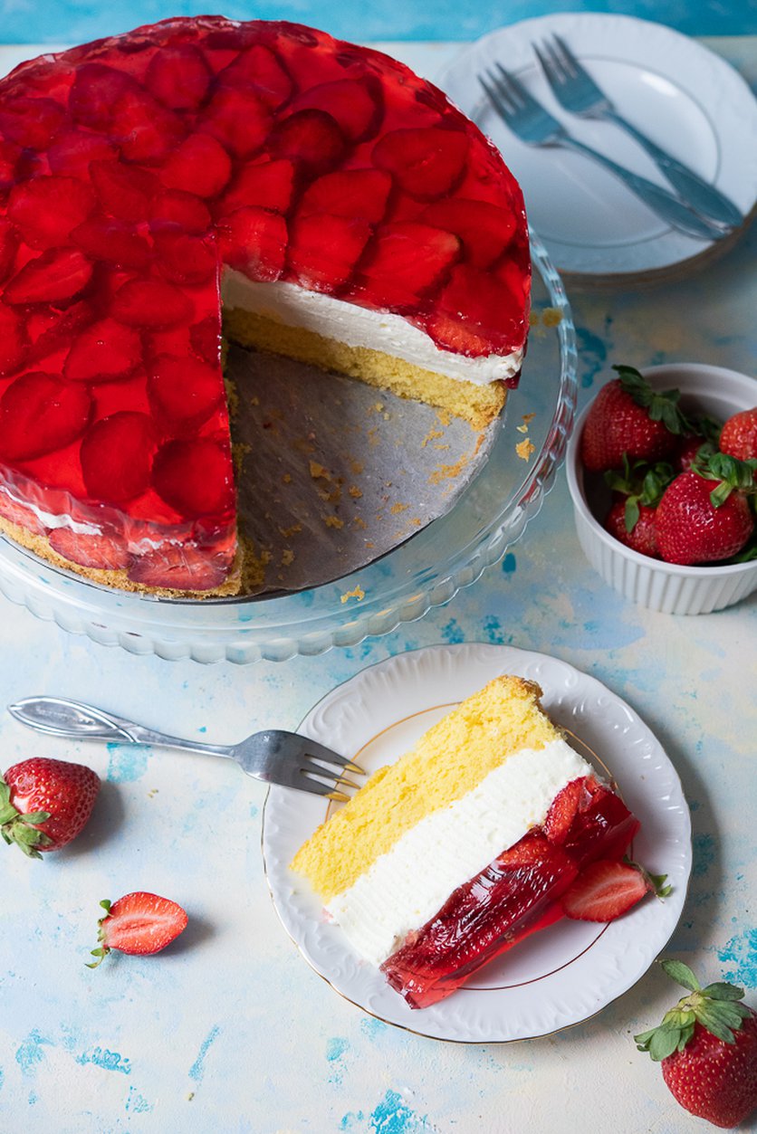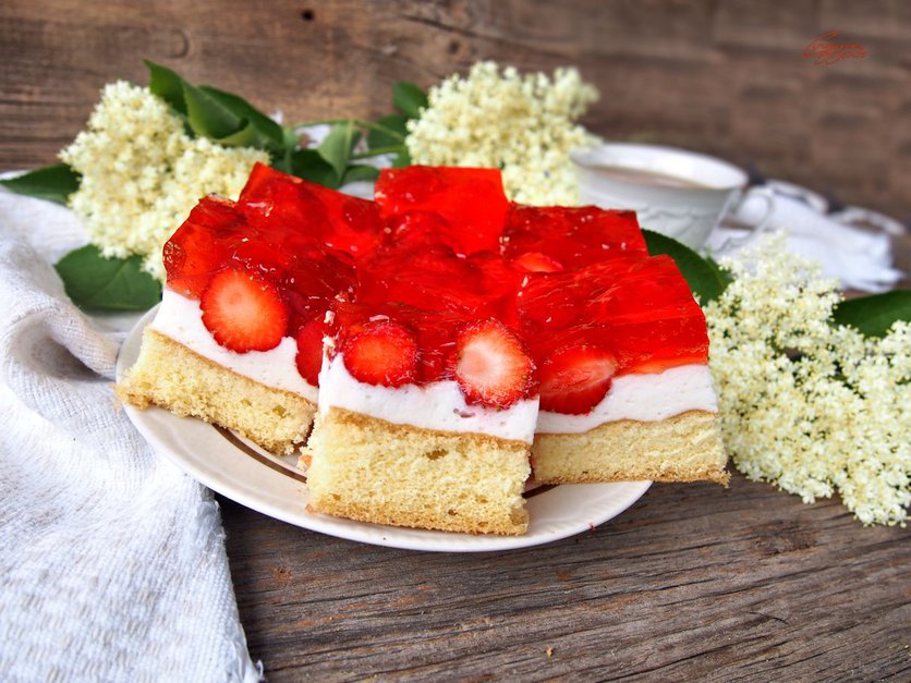 Biszkopt z masą z kwaśnej śmietany z truskawkami i galaretką