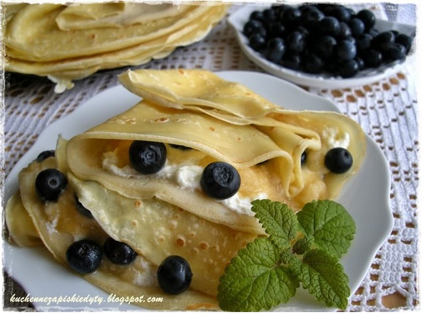 Naleśniki z twarożkiem, musem jabłkowym i borówkami