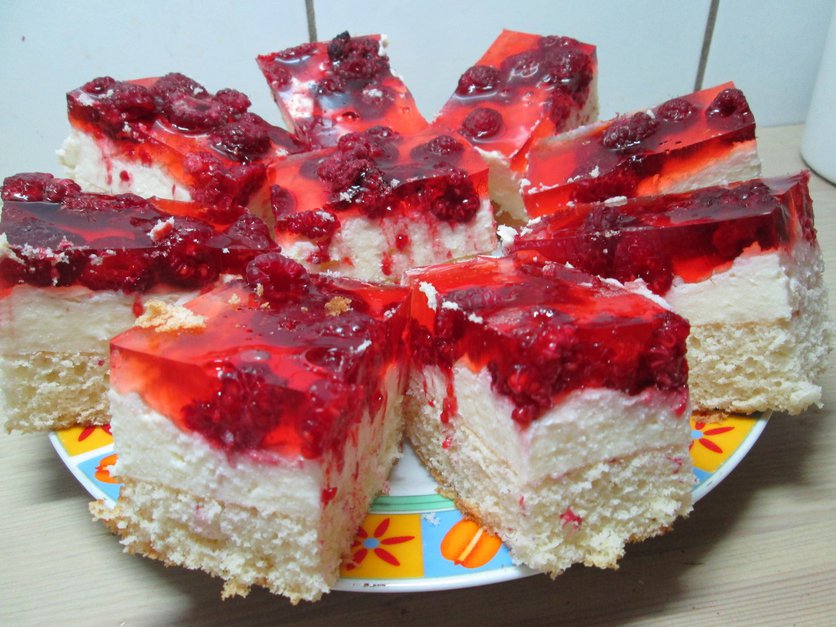 Biszkopt z kremem, malinami i galaretką-pyszne i łatwe ciasto