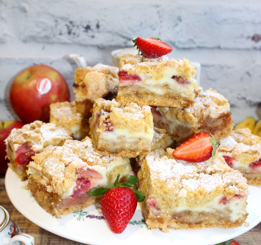 ciasto z truskawkami warstwą jabłek i budyniową pianką