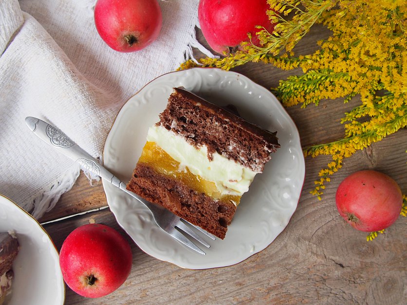 ciasto czekoladowe z kremem budyniowym i jabłkami
