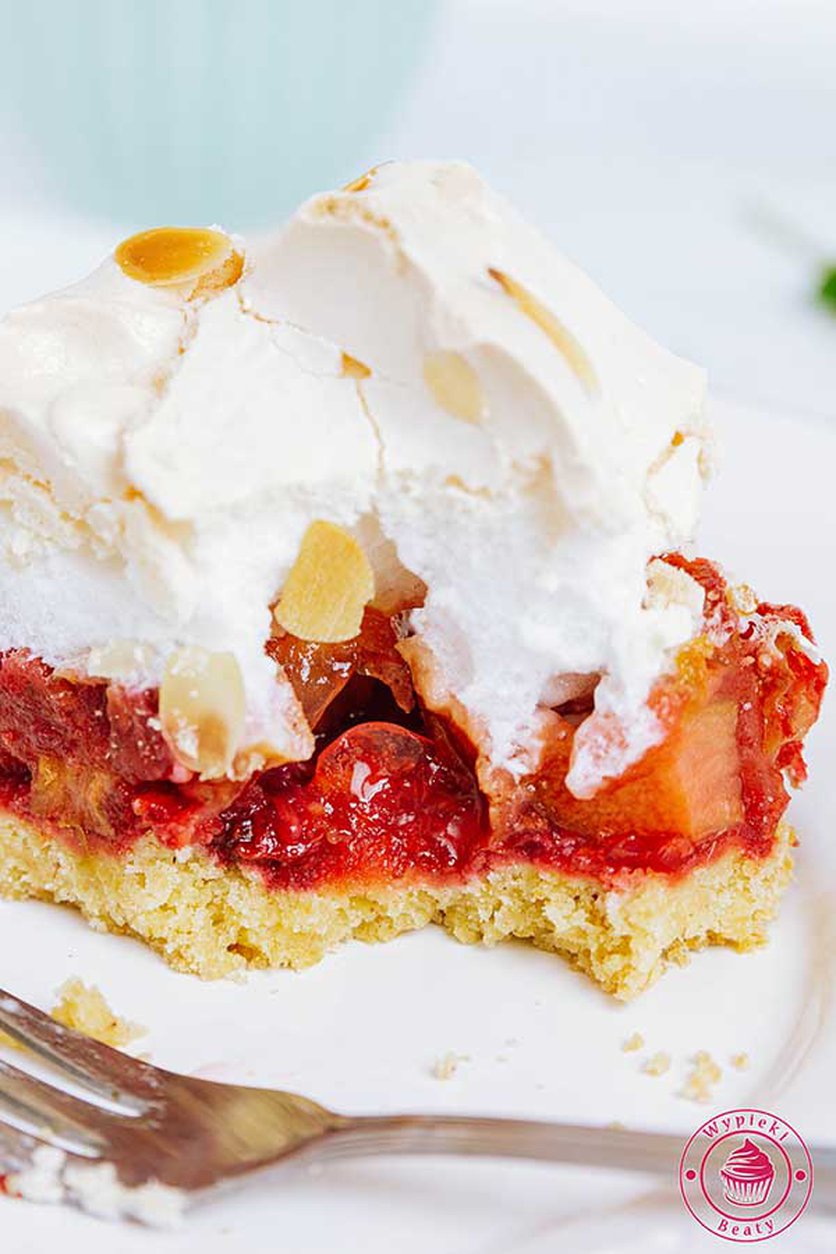 Ucierane ciasto z rabarbarem i migdałową bezą