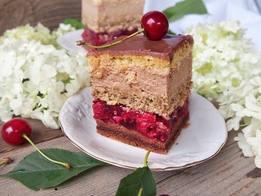 Musowe ciasto czekoladowe z wiśniami i kokosową bezą
