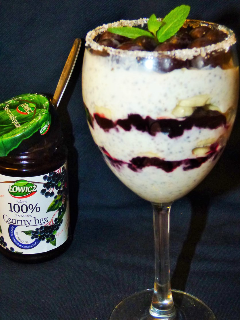 Jogurt z chia, bananem i dżemem z czarnego bzu