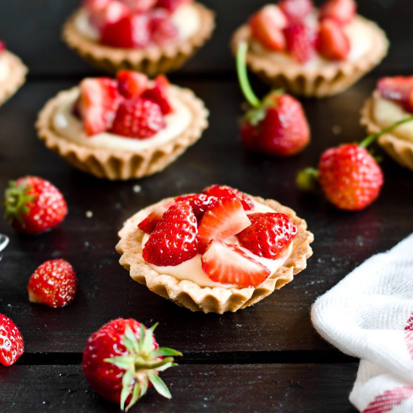 Kruche babeczki z domowym budyniem i truskawkami