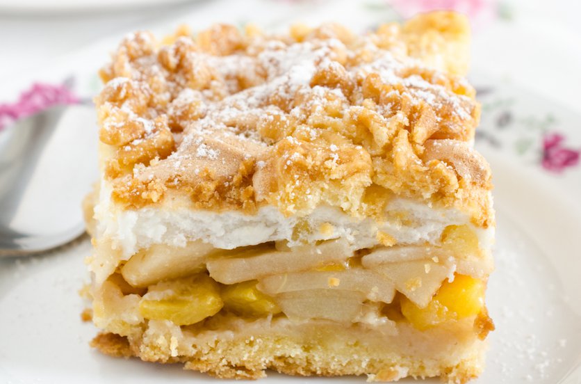 To ciasto to coś więcej niż zwykły jabłecznik! Dodatek gruszek i brzoskwiń podkręca nieźle jego smak