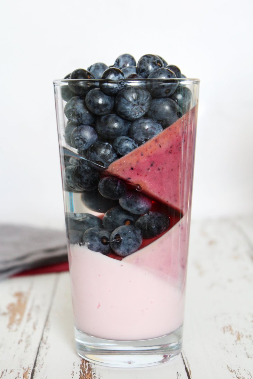 Warstwowy deser z owocami i galaretką