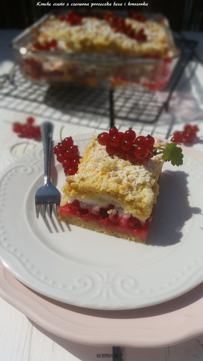 ciasto kruche z czerwonymi porzeczkami bezą i kruszonką