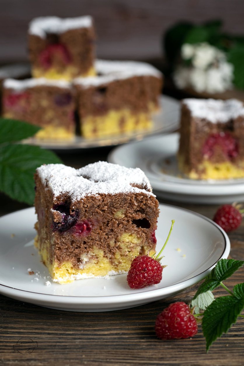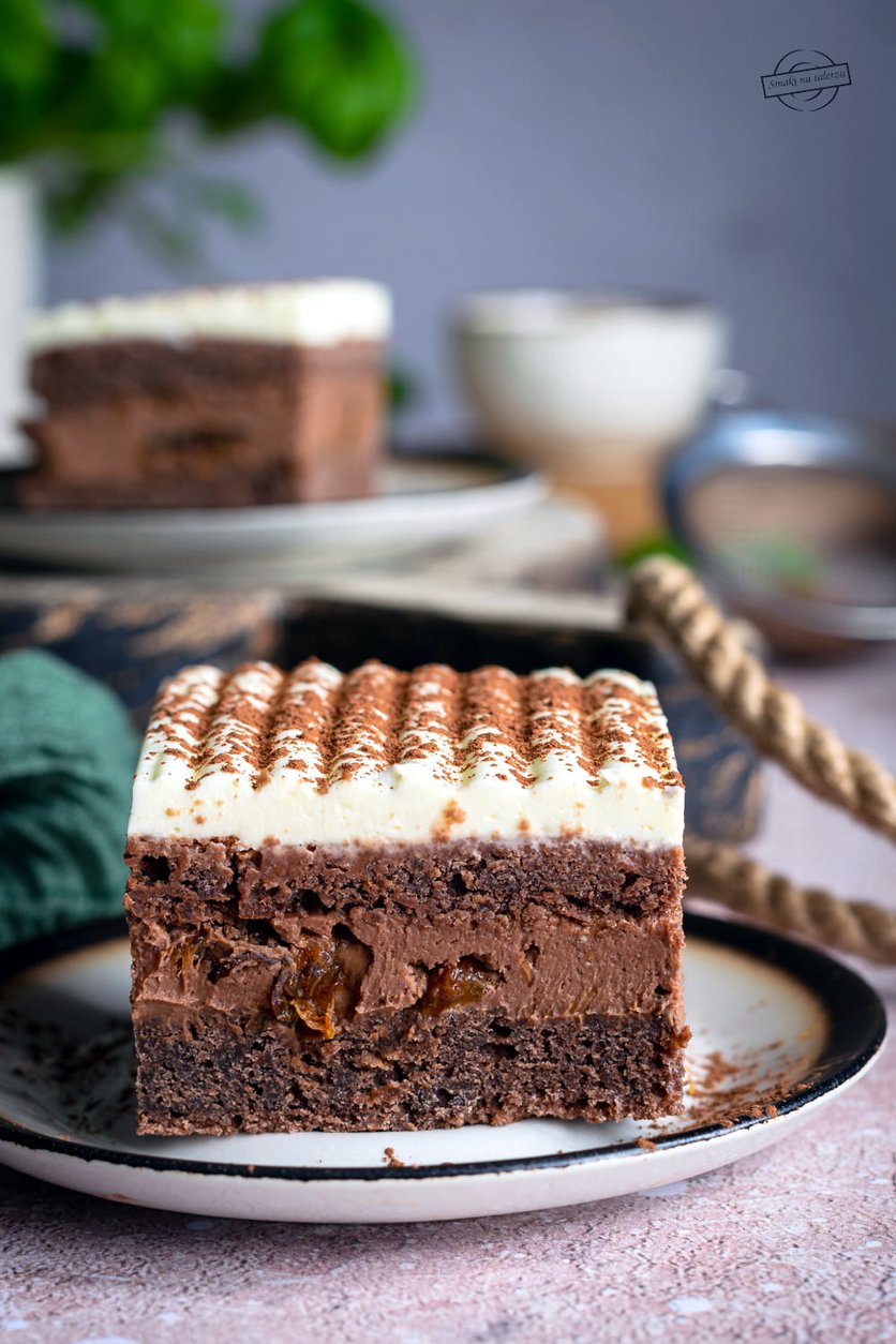 Kakaowe ciasto z kremem czekoladowym, rumowymi śliwkami i bitą śmietaną