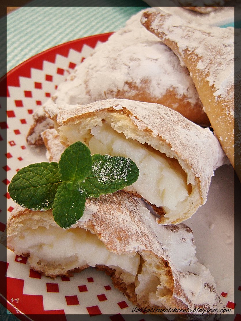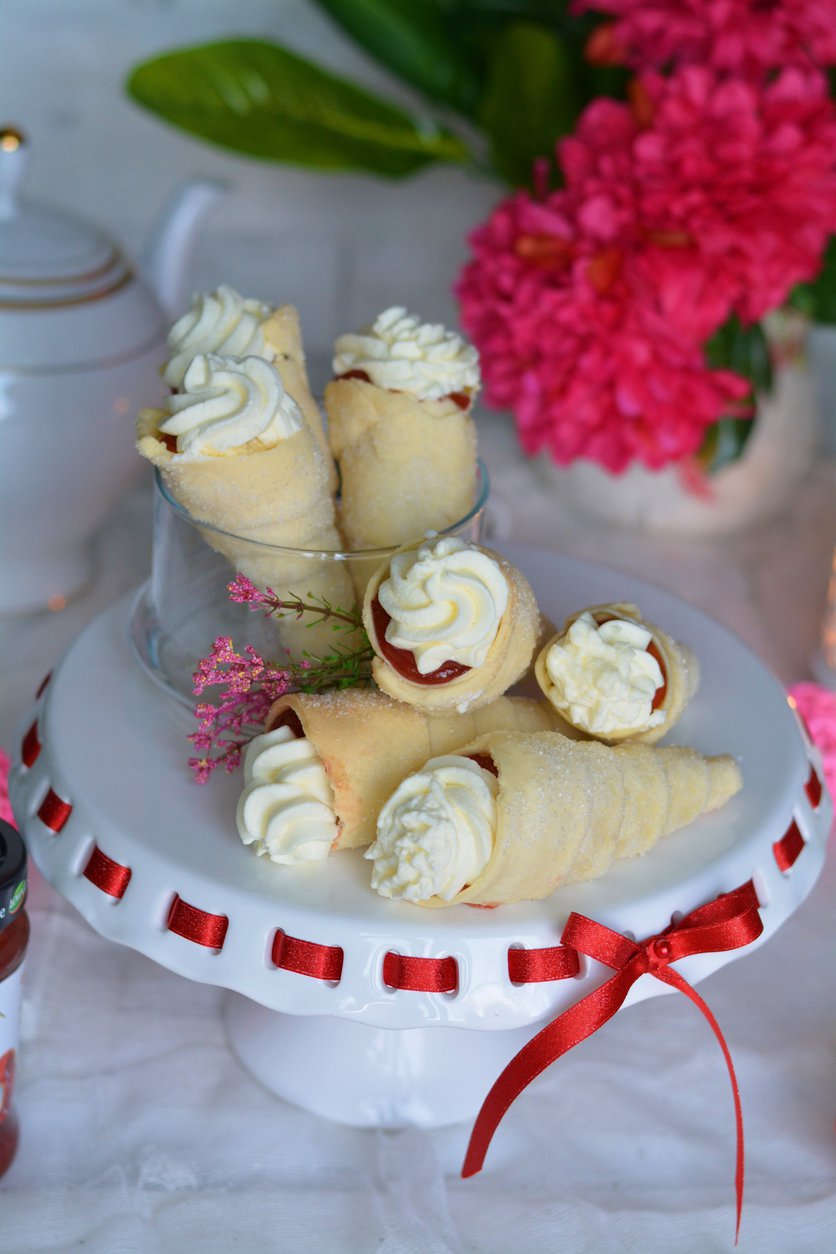 Rożki z masą budyniową, truskawkami i bitą śmietaną