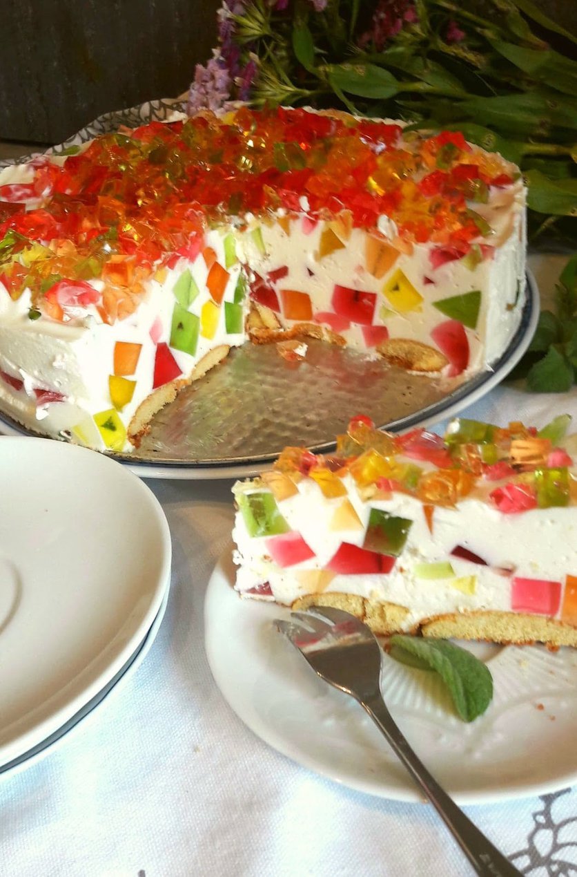 Sernik na zimno z kolorowymi galaretkami