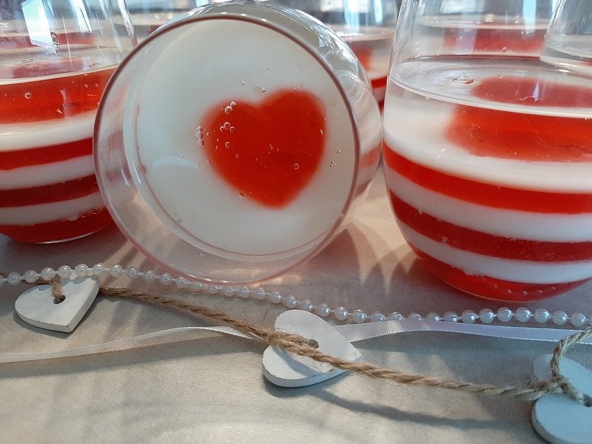 Walentynkowy deser w pucharkach z białej i czerwonej galaretki