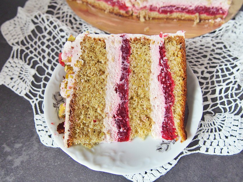 Tort malinowy z pistacjową chrupką w białej czekoladzie