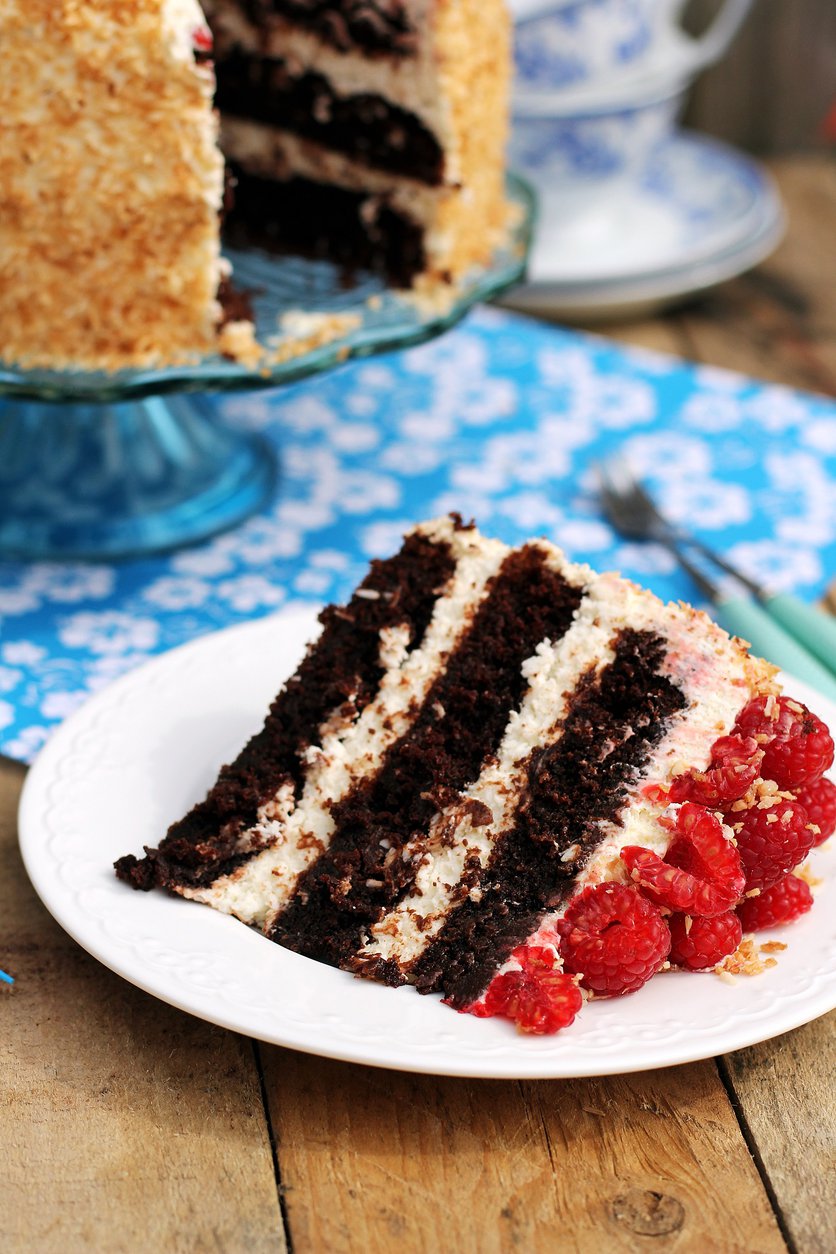 Wilgotny tort czekoladowo-kokosowy z malinami